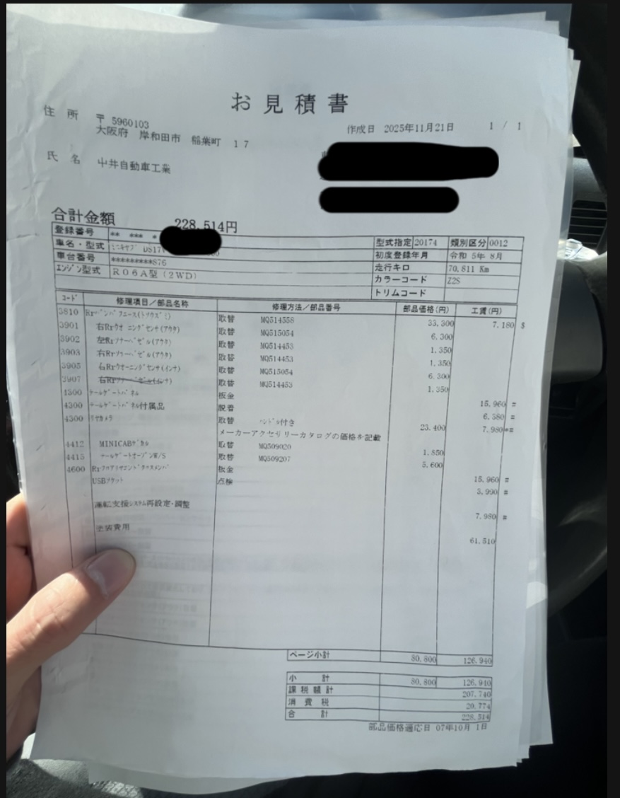 損傷部分のお写真と一緒に、車検書のお写真をお送りいただくか、車検書に記載してある 「型式初度登録年月、車台番号、型式指定番号、類別区分番号」をお伝えください。